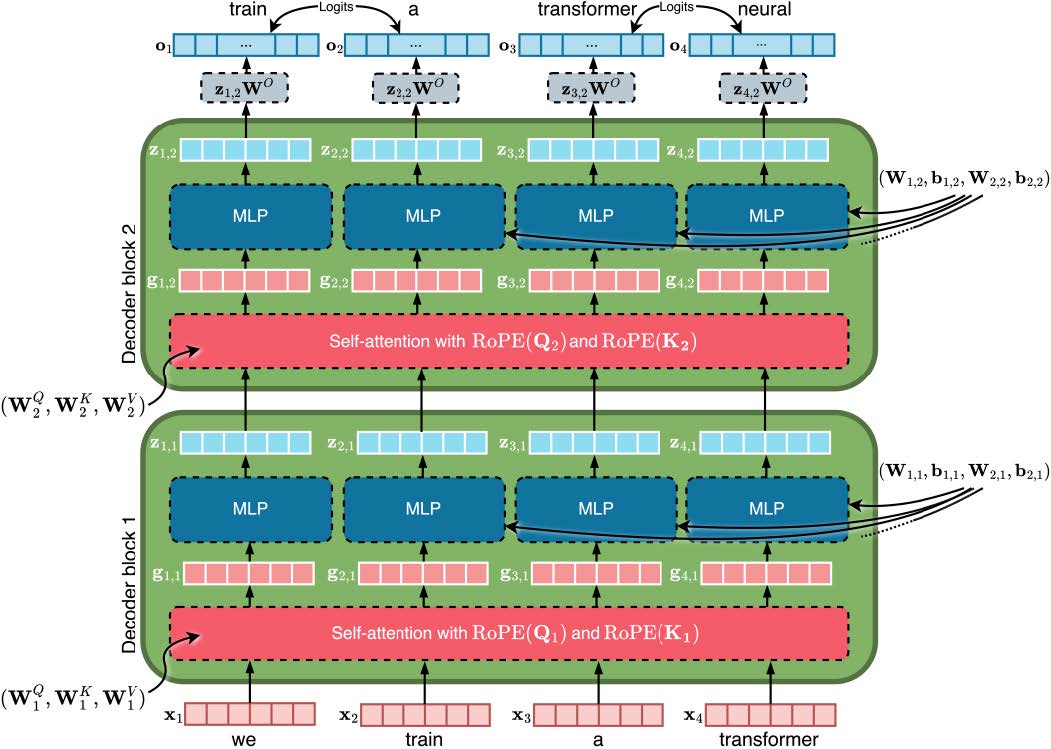 - Die Self-Attention-Schichten kodieren Beziehungen zwischen Tokens. Deren Abstandsabhängigkeit wird durch Rotary Positional Encoding (RoPE) erfasst, Rotationen in 2-dimensionalen Unterräumen der Embedding-Vektoren (wobei für festen Abstand die Rotationswinkel für Dimensionen 1+2 am größten sind und für hohe Dimensions-Indizes schnell abfallen).