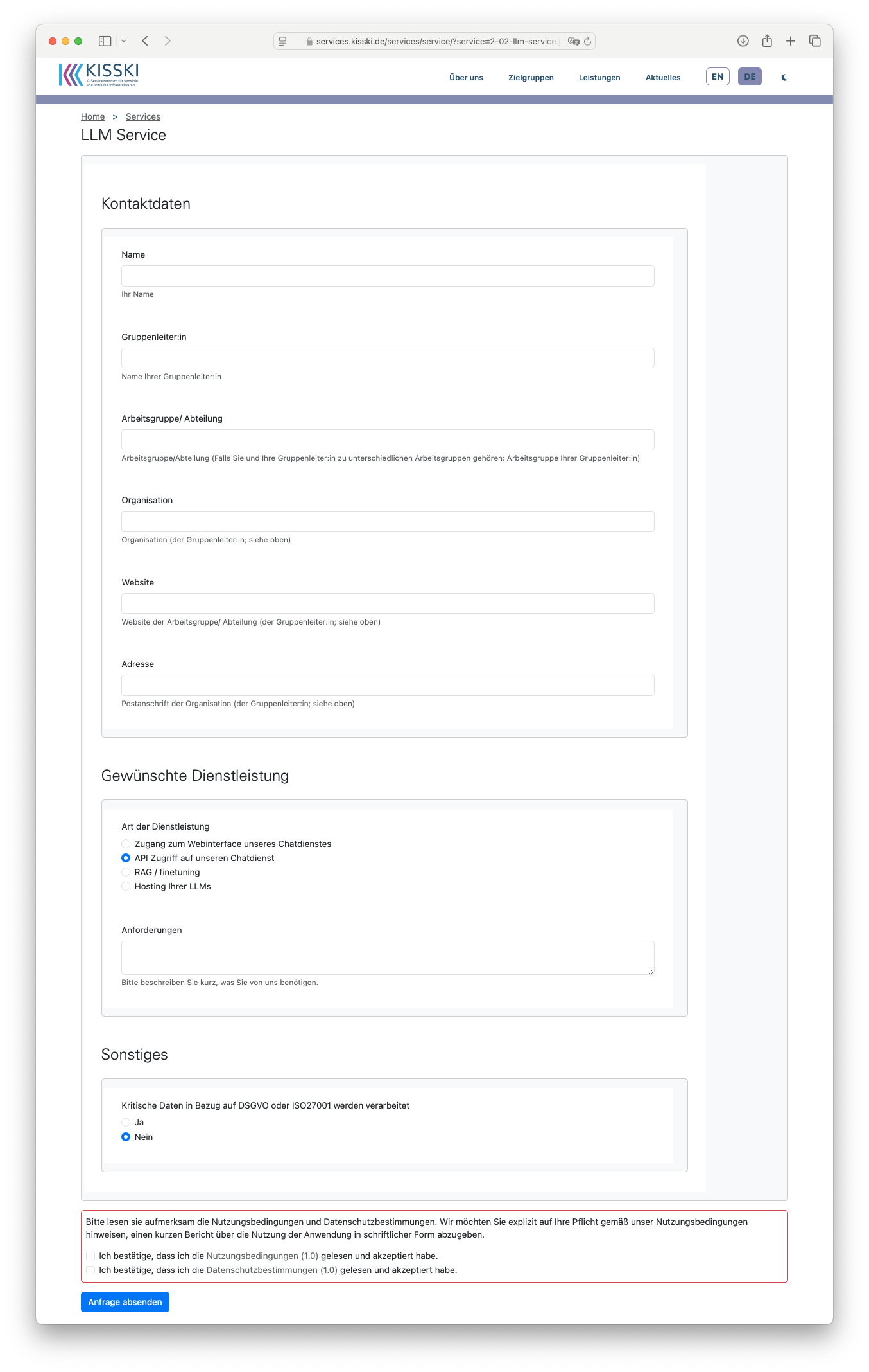 wovon die zweite anzwählen ist. Es ist zu vermuten, dass bei “Kritische Daten in Bezug auf DSGVO oder ISO27001 werden verarbeitet” unbedingt das Nein-Feld anzukreuzen ist, da in den Nutzungsbedingungen die Verarbeitung personenbezogener Daten untersagt wird (was den Vorteil des datenschutzfreundlichen Hostings durch eine deutsche Behörde gegenüber ChatGPT & Co relativiert).